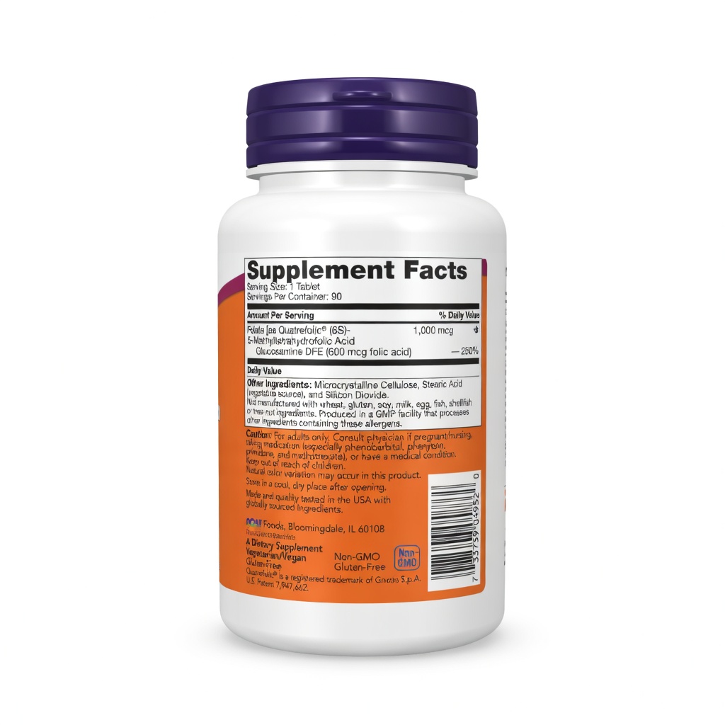 المكونات الرئيسية: فولات (كـ 400 ميكروجرام ميثيل تتراهيدروفولات)، سيلولوز دقيق البلورات، كبسولة نباتية (هيبروميلوز)، ستيرات المغنيسيوم (مصدر نباتي).