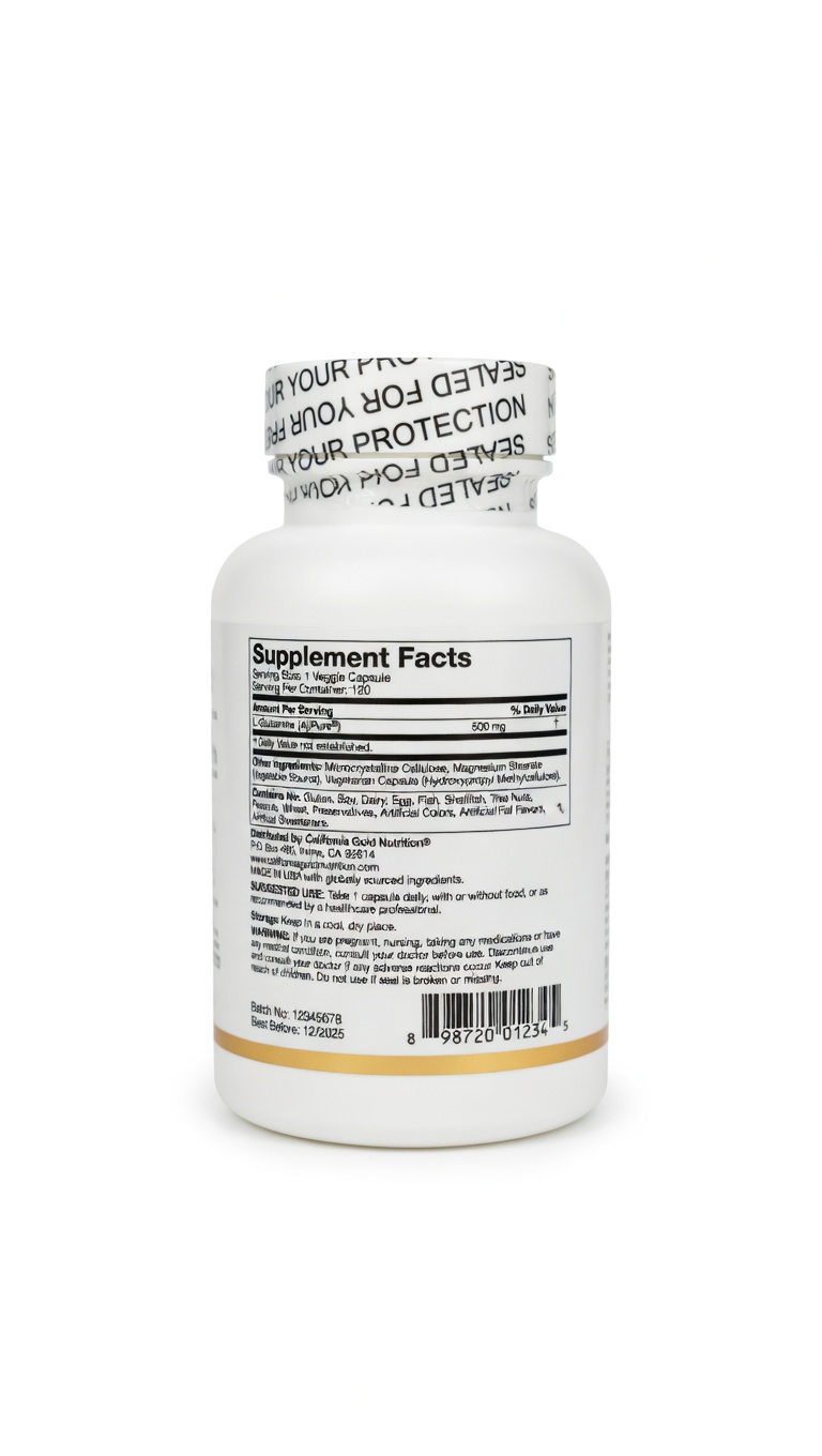 المكونات: L-Glutamine (AjiPure®)، كبسولة نباتية (هيبروميلوز)، سيلولوز دقيق البلورات، ستيرات المغنيسيوم (مصدر نباتي).