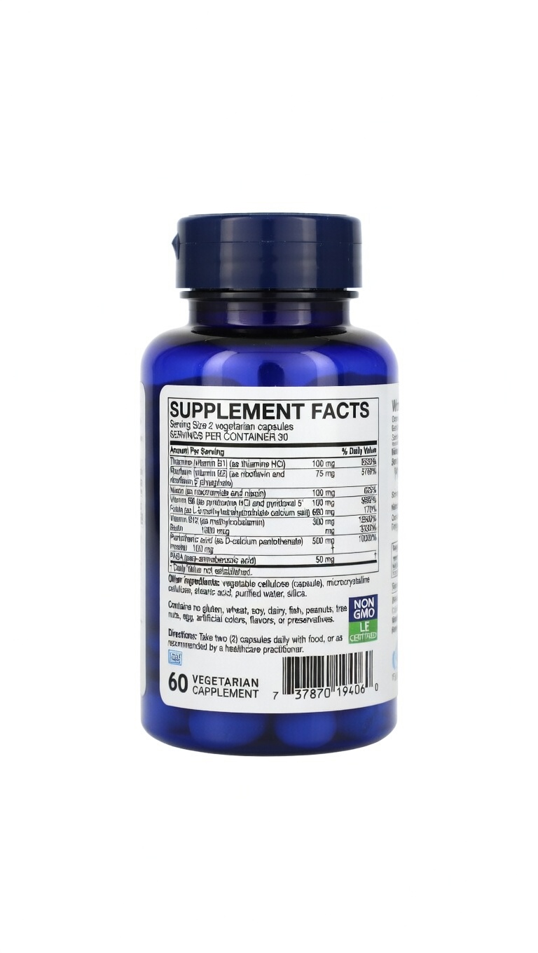 المكونات الرئيسية: فيتامين B1، B2، B3، B5، B6، B7، B9، B12 بنسخها النشطة، كبسولة نباتية.