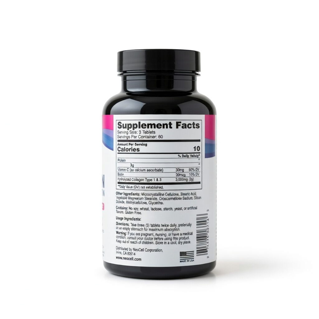 هذه ليست مجرد حبوب كولاجين؛ إنها تركيبة متطورة تجمع بين “كولاجين النوع 1 و 3” المحلل مائياً لضمان أقصى امتصاص، معززة بـ البيوتين لجمال الشعر وفيتامين C لتحفيز إنتاج الكولاجين الطبيعي في جسمك. مع Bioskindz، نمنحكِ الحل الشامل لتقوية الأظافر، تكثيف الشعر، والحصول على بشرة نضرة ومفاصل مرنة. جمالكِ يبدأ بقرار ذكي، والذكاء هو اختيار Neocell.
