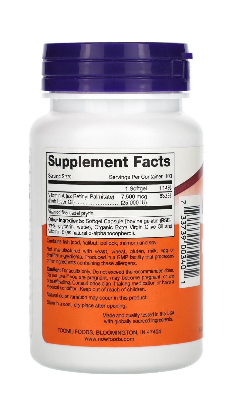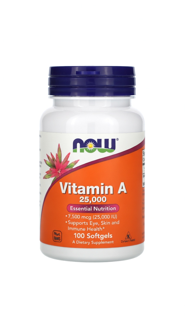 يدعم Vitamin A من NOW Foods صحة العيون، الجلد، والمناعة بقوة، ويُعد من أهم الفيتامينات الأساسية للجسم.