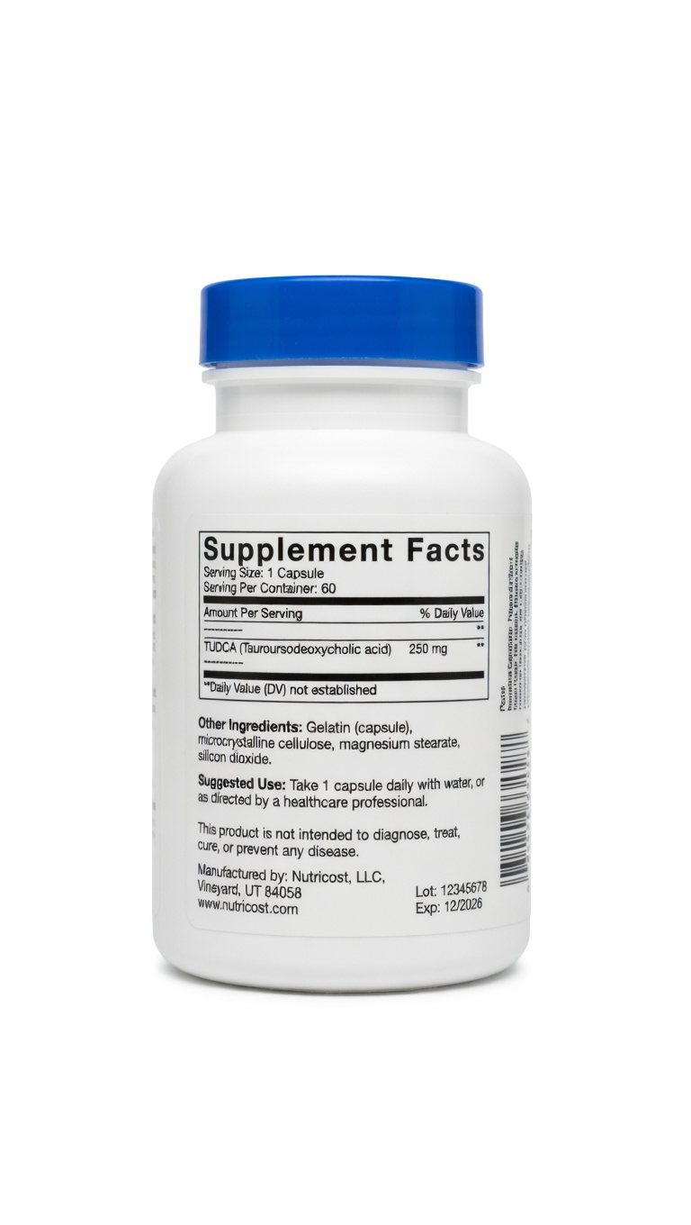 المكونات: Tauroursodeoxycholic Acid (TUDCA) 250 mg، كبسولة نباتية، مواد مالئة (سليولوز دقيق البلورات، ستيرات المغنيسيوم).